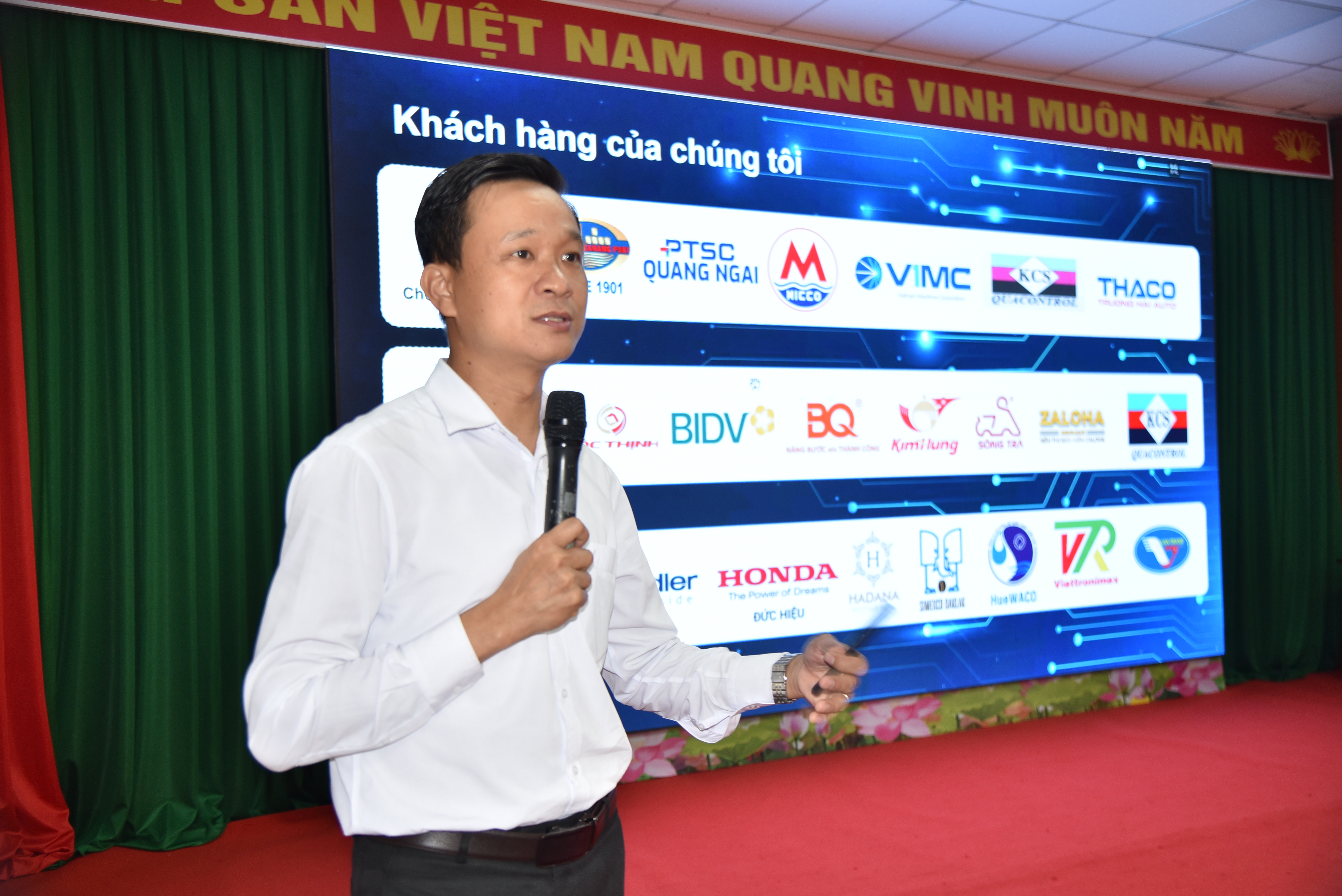 Hình 3. Đại diện Công ty TNHH kỹ thuật công nghệ điện tự động Biển Đông (ESTEC) giới thiệu về hệ thống quản trị sản xuất thông minh (MES)